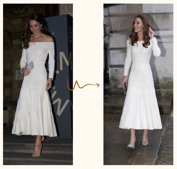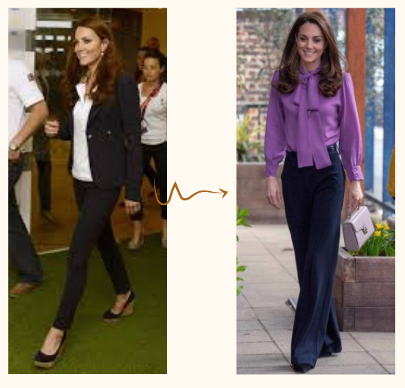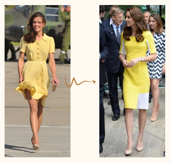 Os comprimentos das roupas também mudaram com o passar dos anos. Kate usava vestidos sempre acima dos joelhos, passando uma imagem de jovialidade por vezes interpretada como imaturidade. Agora ela opta por peças midi ou na altura da canela. Esse novo tamanho reforça a ideia de uma mulher madura e segura.